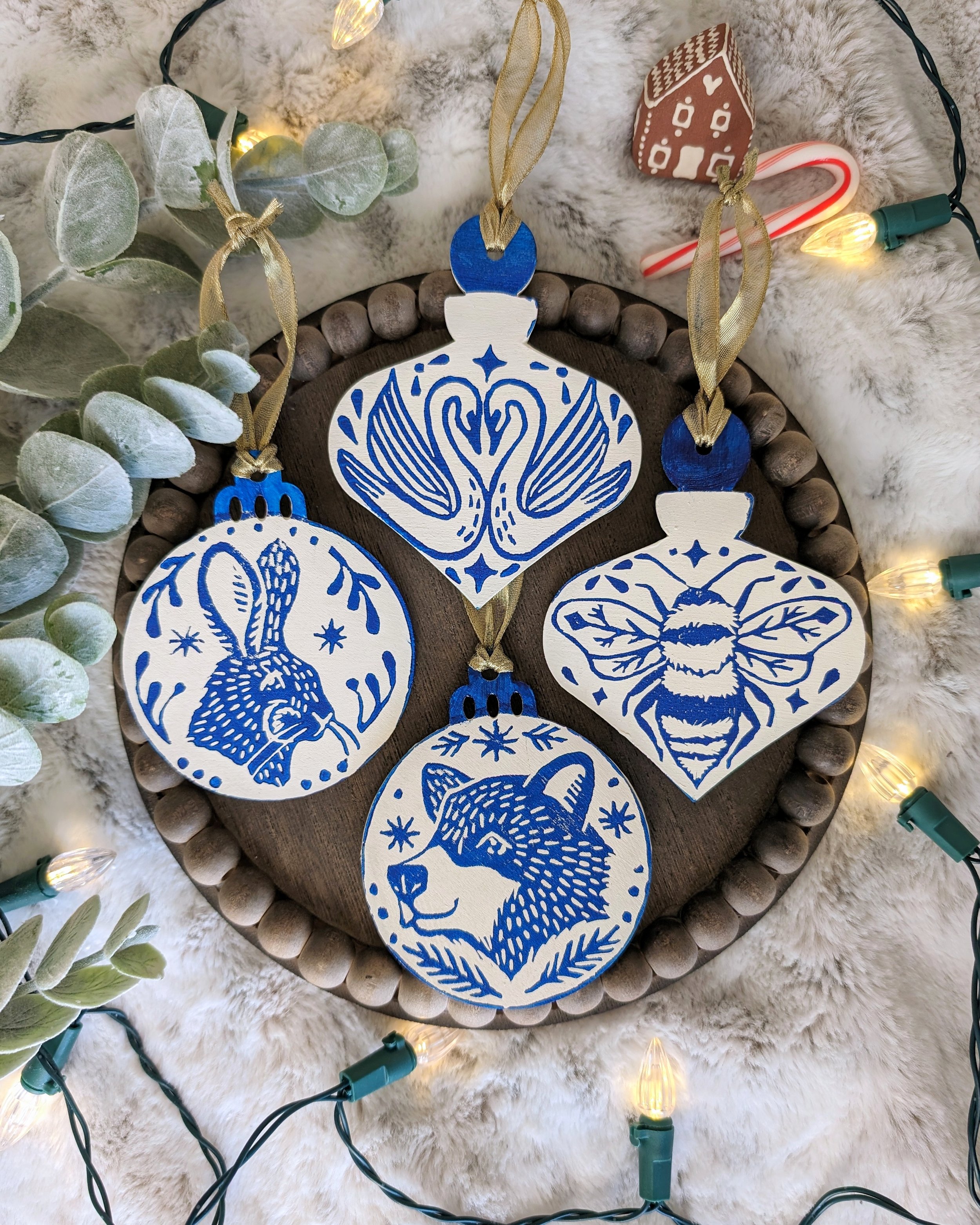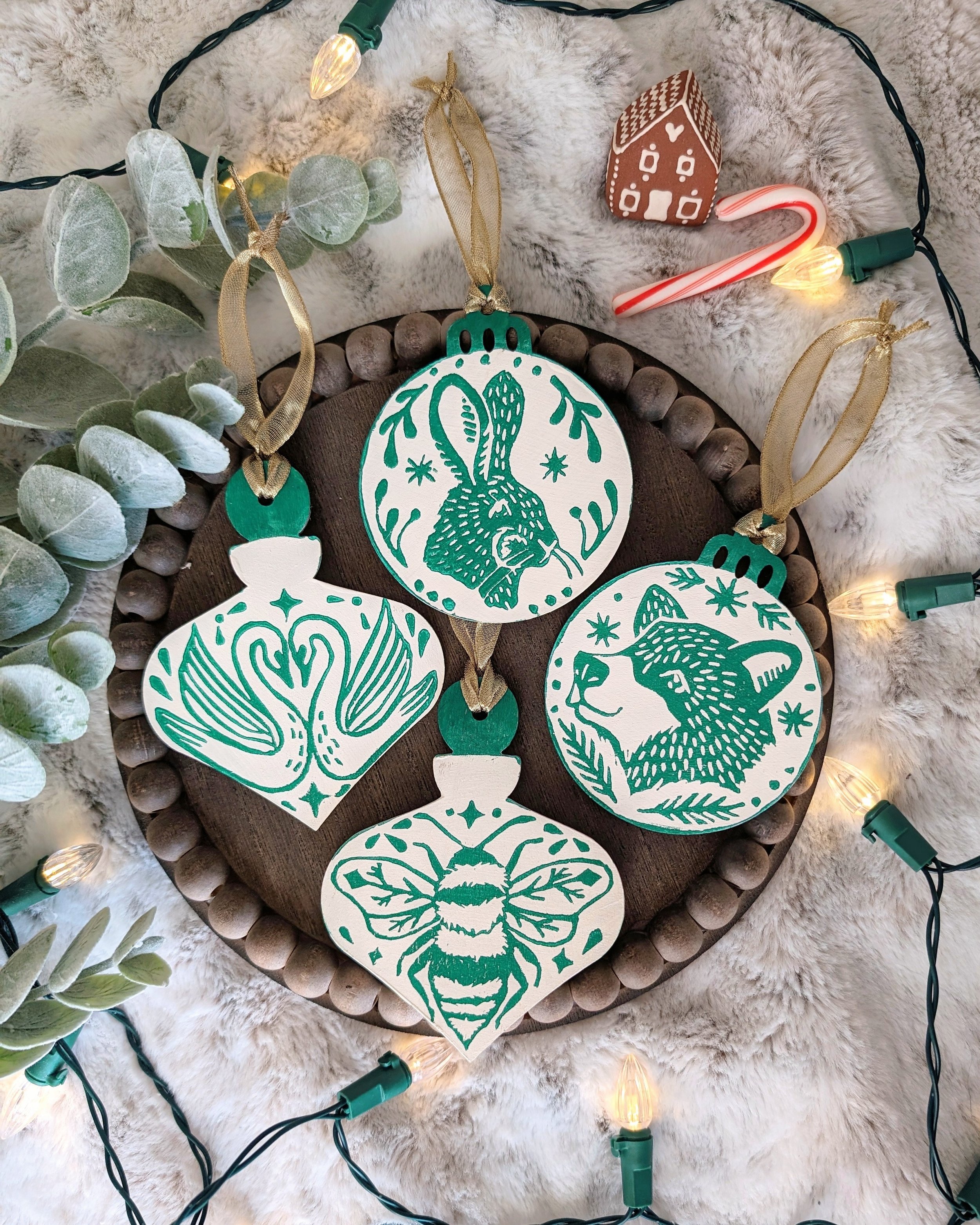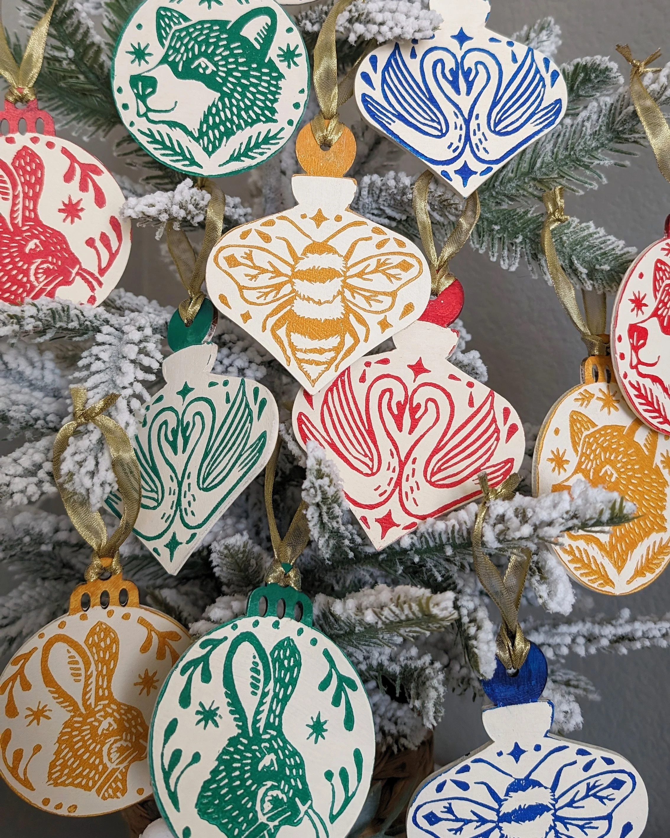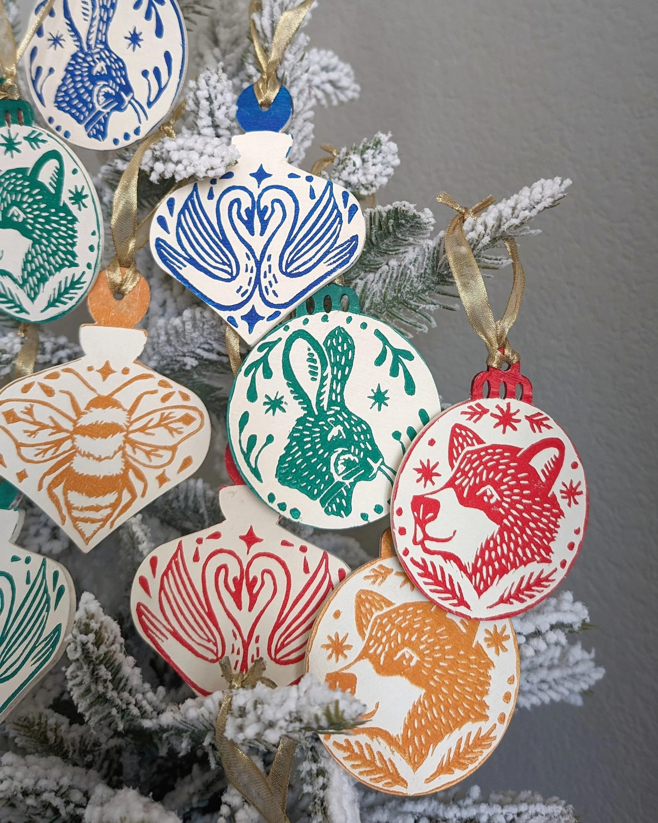 Each design was hand carved and then printed onto a wooden ornament using a long lasting oil based ink.