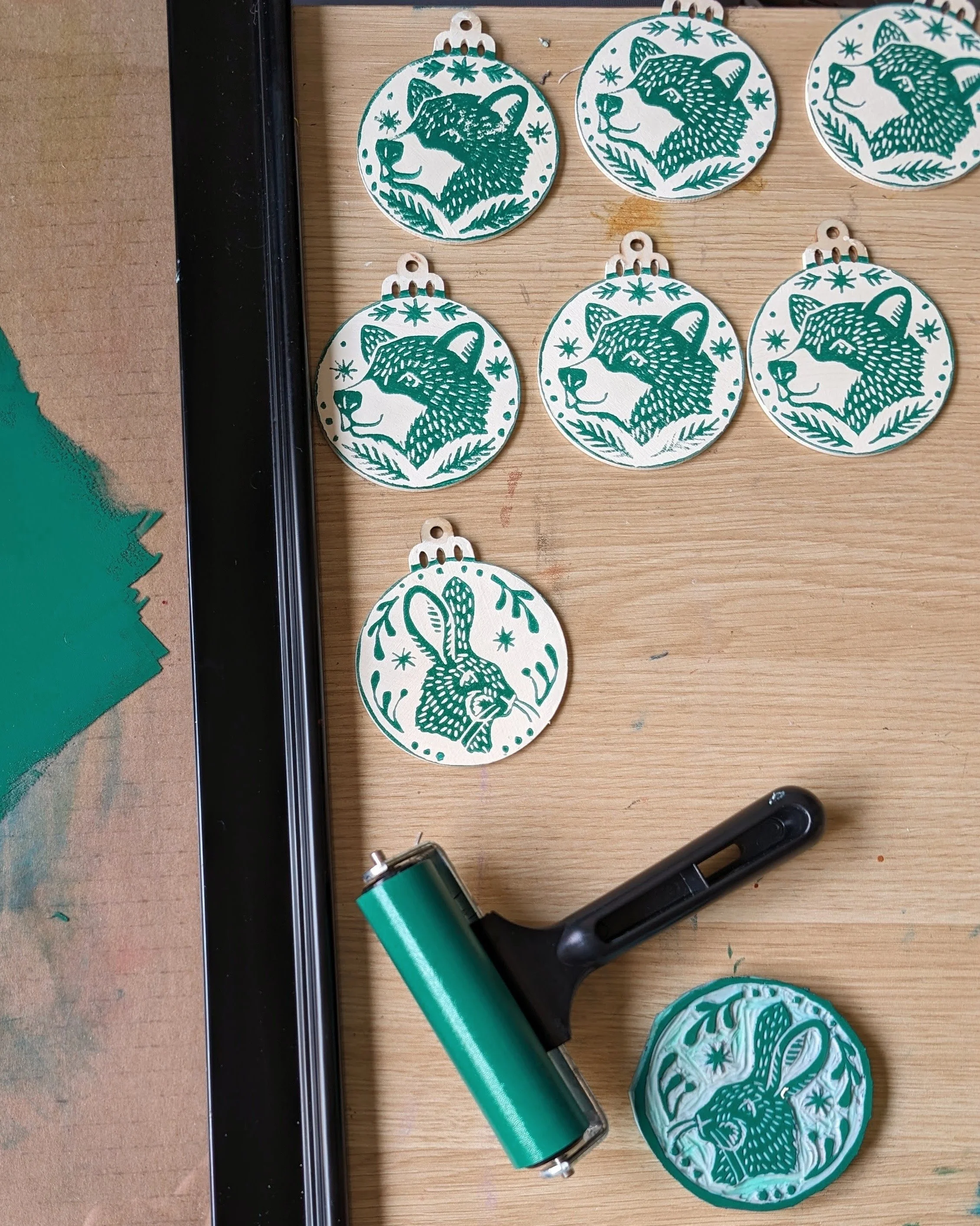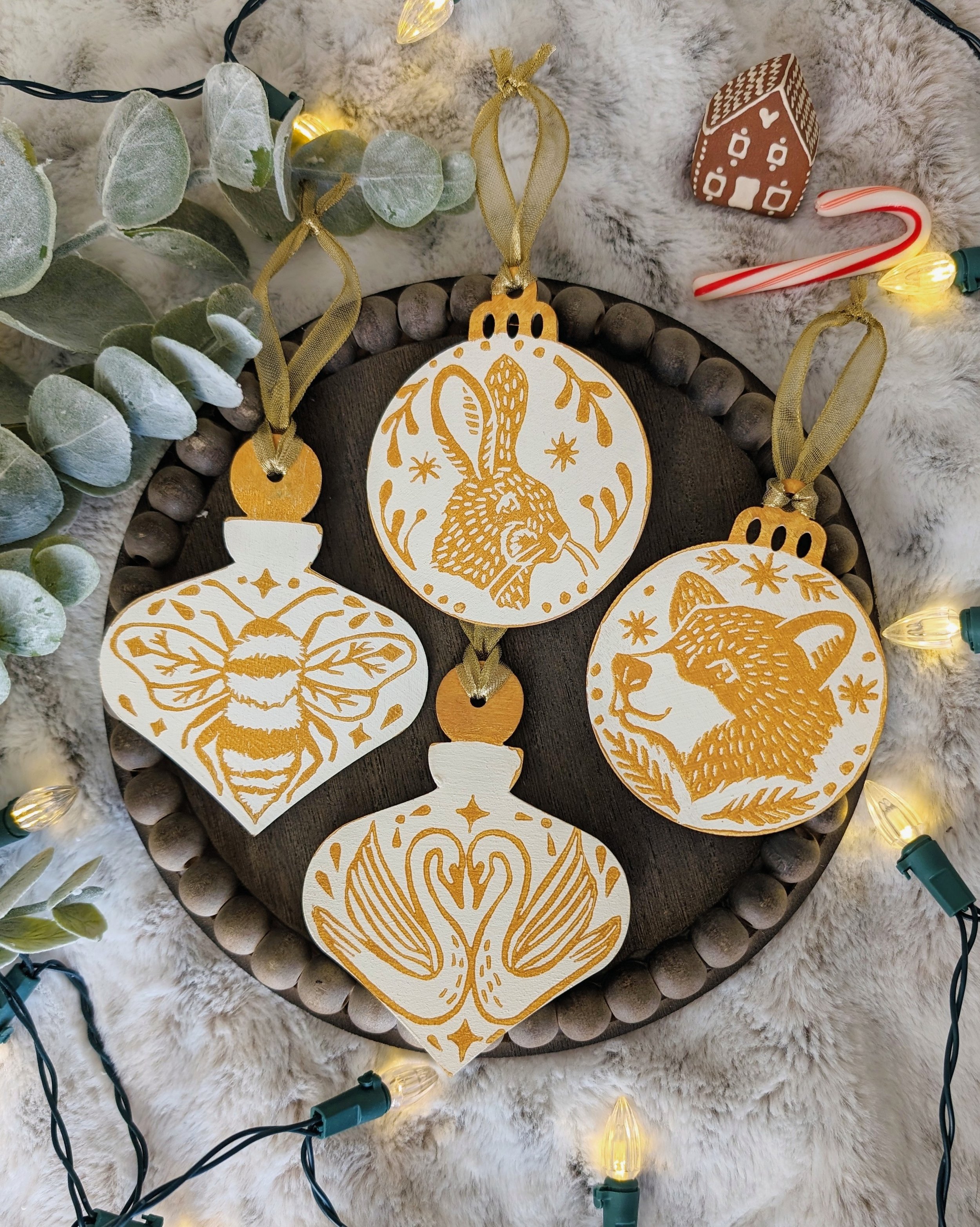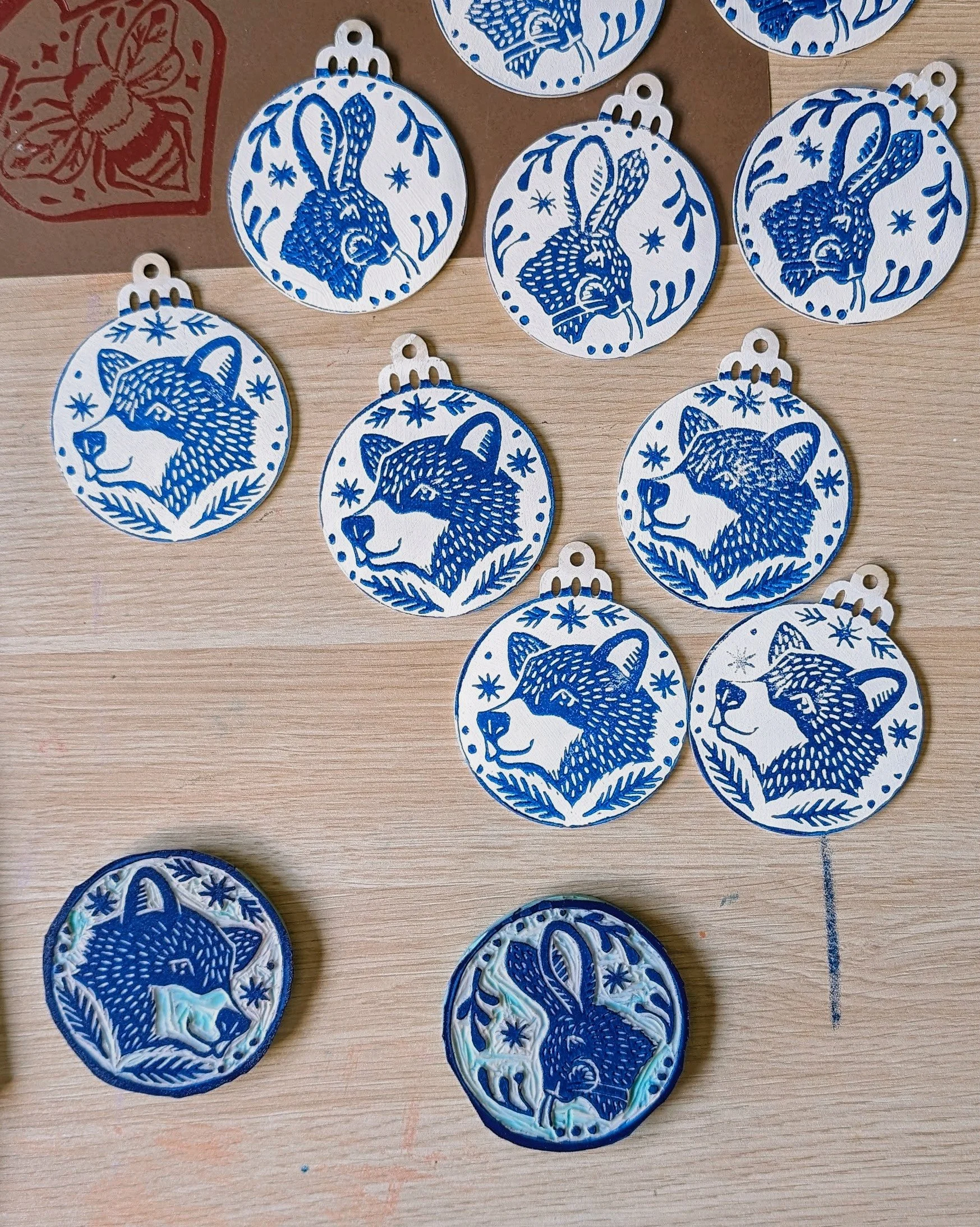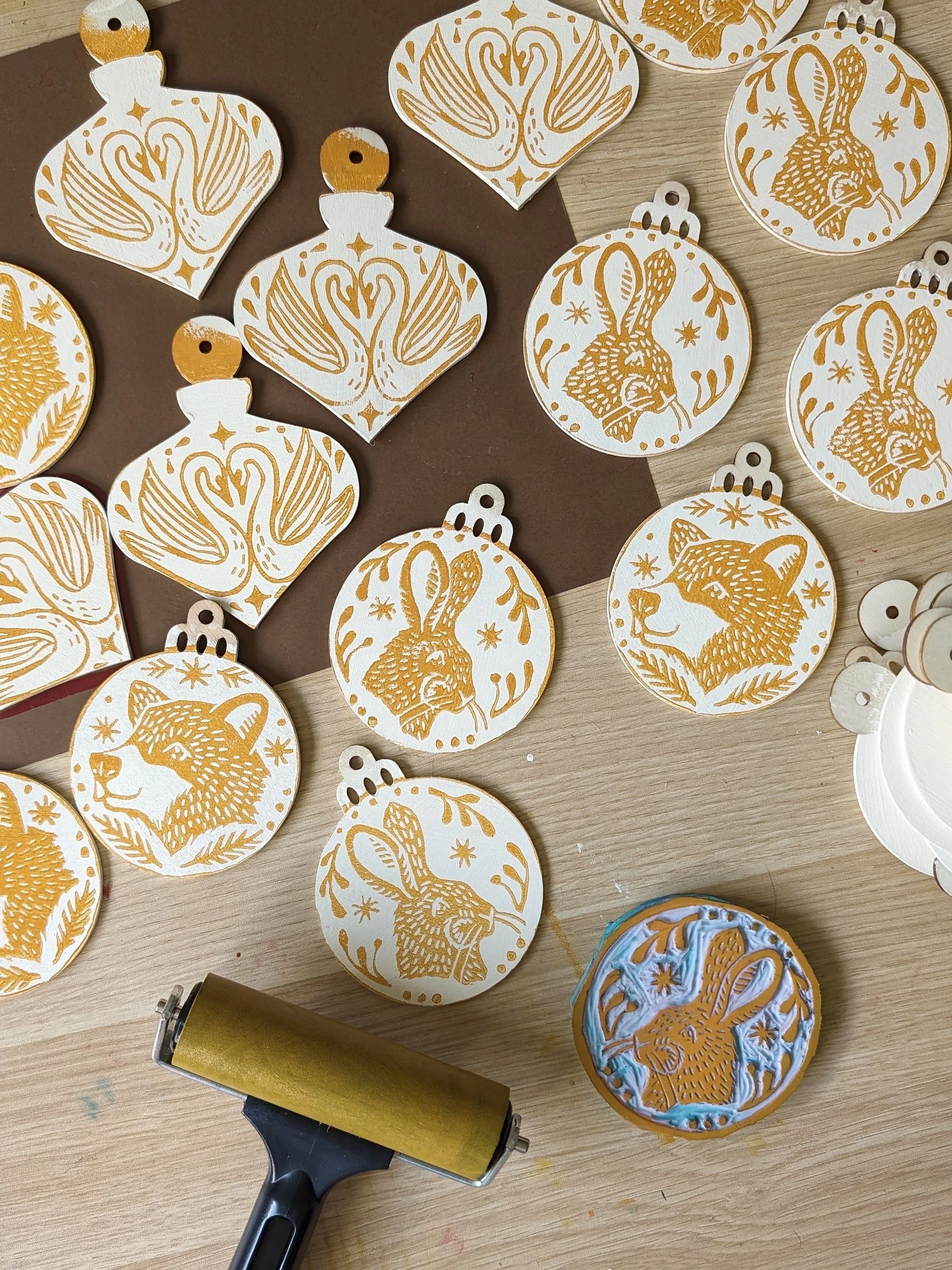 Each design was hand carved and then printed onto a wooden ornament using a long lasting oil based ink.